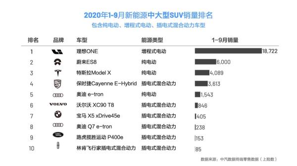 而蔚来、理想和小鹏之中,我想最值得一提的还是理想汽车。身为三家车企中唯一彻底解决新能源汽车续航焦虑的造成新势力,理想依靠理想ONE一己之力就实现1-9月卖出18722台,连续第9个月超越蔚来ES8、保时捷Cayenne E-Hybrid、特斯拉Model X等车型,蝉联新能源中大型SUV市场冠军,足见其产品实力深受消费者认可。最关键的是,理想ONE上月销量还是继6、7、8连续三月销量上升后的再一次增长,也是理想ONE单月销量的又一次新高,而这虽与理想汽车的零售中心扩充速度快有着直接的关系,但从中我们也不难看出理想ONE强大的市场活力。